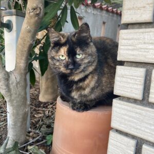 とてもビビりのシャーシャー猫だったのでビビと名付けました。この子も2年前の春ごろちょっと成長した子猫の頃に現れて、プープーとポポを少し遠巻きにしながらも近場に居つきました。一年以上近づくこともできなかったけど、去年の春、子猫を2匹出産してから少しずつ距離を縮めて、夏を過ぎた頃にはやっと身体に触れるようになり、徐々に抱っこもできるようになりました。でもやはり直ぐに下りてしまいます。抱き上げると小さな声でささやくように鳴くのがとても可愛いです(ガラガラ声だけど笑)。出産する前に避妊手術したかったのですがなかなか捕獲できず一回の出産をする事になったけどその後避妊手術済です。